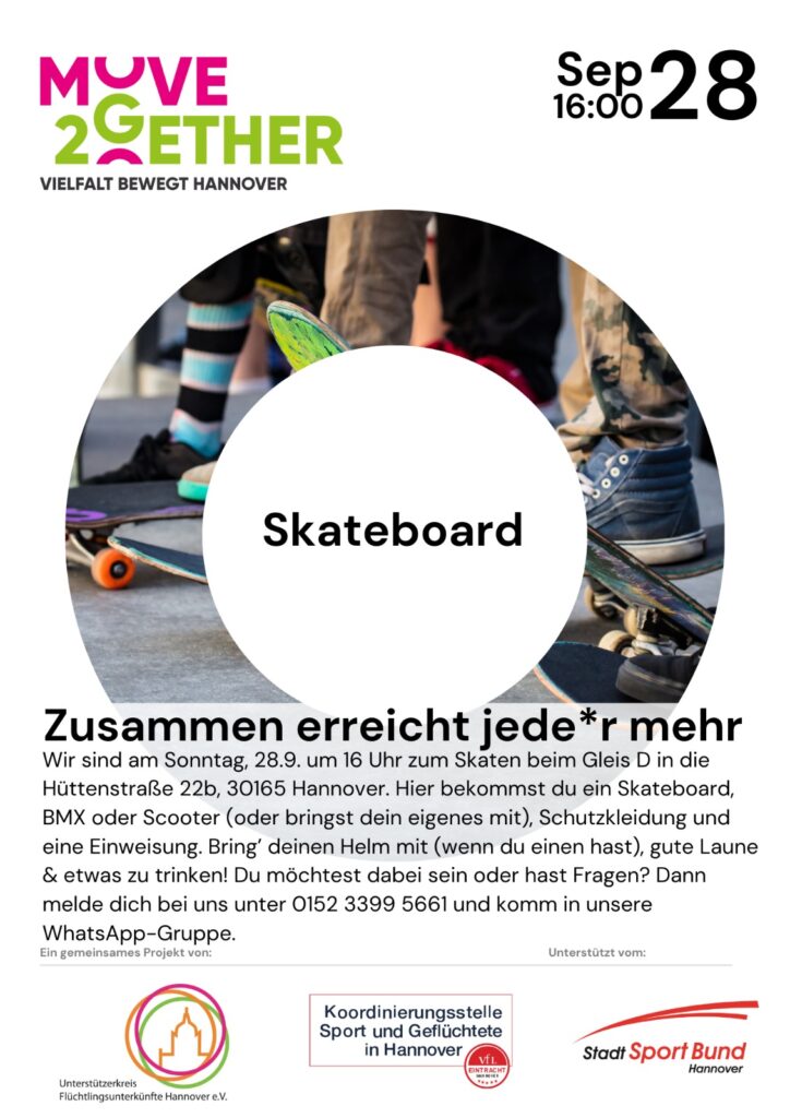 Am Sonntag, 28. September um 16:00 Uhr treffen wir uns zum Skateboarden beim Gleis D in der Hüttenstraße 22b, 30165 Hannover. Bei Interesse oder Fragen, bitte über WhatsApp-Gruppe Link zur WhatsApp-Gruppe oder 0152 3399 5661.
