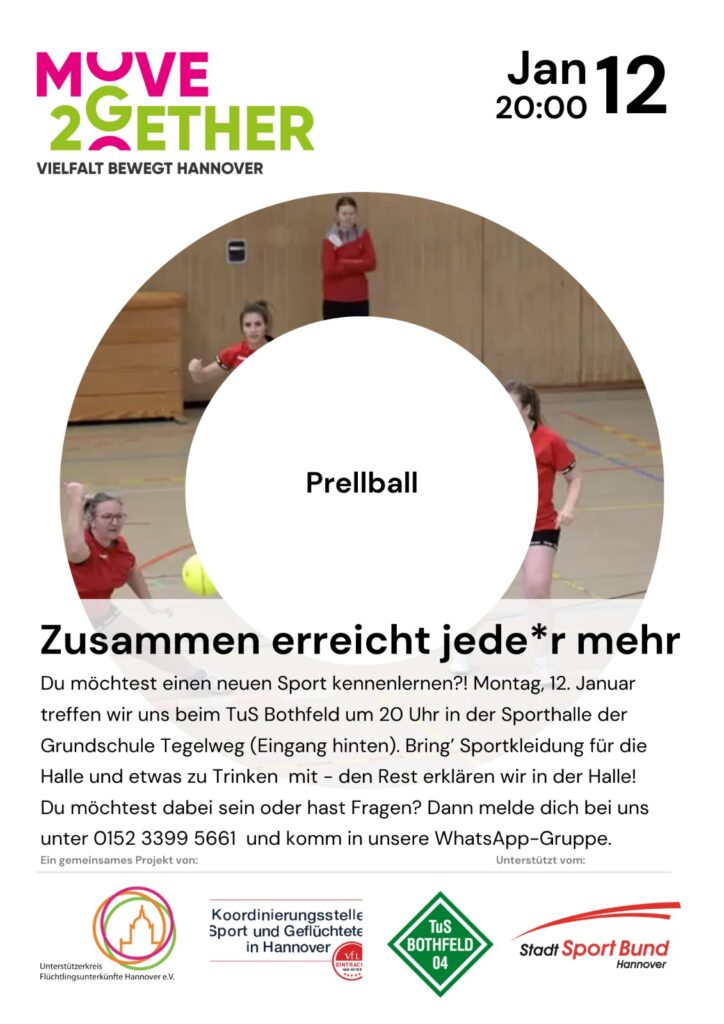 Am Montag, 12. Januar um 20:00 Uhr treffen wir uns beim TuS Bothfeld zum Prellballspielen in der Sporthalle der Grundschule Tegelweg (Eingang hinten). Bei Interesse oder Fragen, bitte über WhatsApp-Gruppe Link zur WhatsApp-Gruppe
