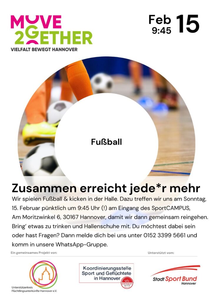 Am Sonntag, 15. Februar um 9:45 Uhr treffen wir uns pünktlich zum Fußballspielen am Eingang des SportCAMPUS. Bei Interesse oder Fragen, bitte über WhatsApp-Gruppe Link zur WhatsApp-Gruppe oder 0152 3399 5661.