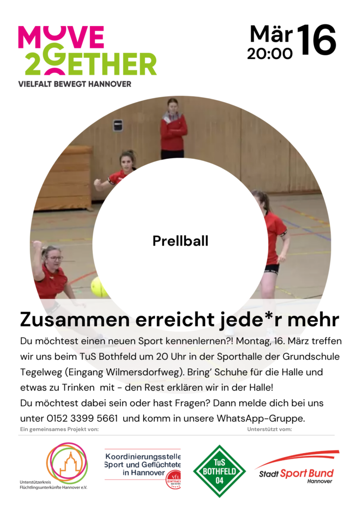 Am Montag, 16. März um 20:00 Uhr treffen wir uns beim TuS Bothfeld zum Prellballspielen in der Sporthalle der Grundschule Tegelweg (Eingang hinten). Bei Interesse oder Fragen, bitte über WhatsApp-Gruppe Link zur WhatsApp-Gruppe oder 0152 3399 5661.